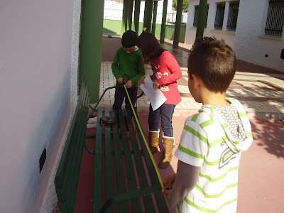 A lo largo de la semana pasada hemos estado trabajando eso de los centímetros, los metros y los kilómetros, además de conocer algunos instrumentos para medir longitudes (reglas, flexómetros, cintas métricas...) y la forma de elegir y utilizar los que mejor se adecuan al objeto a medir. Como tanto oímos hablar de las Competencias Básicas, pues alaaa, todo el mundo a medir. Hemos bajado al patio y hemos medido todo, todo y todo y lo hemos apuntado en una ficha. Hemos disfrutado mucho midiendo. Sobre todo a la hora de enrollar la cinta métrica imitando a buenos pescadores de caña. ¡Algunos incluso han picado!